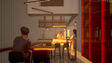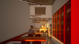 O pavimento em mosaico de terrazzo confere textura e ritmo táctil ao espaço, enquanto as chapas metálicas perfiladas, com acabamento em branco pérola, revestem paredes e tectos, reflectindo a luz e criando um subtil cariz industrial. No tecto, a estrutura em betão em forma de caixa de ovos, actua simultaneamente como elemento acústico e escultórico, reforçando a identidade arquitectónica do interior. O balcão, com acabamento em tons de vermelho-escuro (oxblood), assume o papel de ponto focal - um contraste cromático marcante face à paleta contida dos restantes materiais.